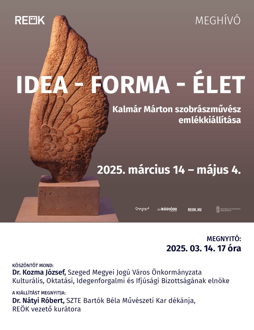 Nagyformátumú művészegyéniségét közel száz szobor, grafika, festmény, érem és kisplasztika hivatott megidézni a REÖK legújabb kiállításán. Az Idea – forma – élet címet viselő emléktárlat igazán megmozgatta a szegedieket: valódi, társadalmi összefogással született meg annak érdekében, hogy minél teljesebb képet formálhasson a néhai alkotó munkásságáról. A REÖK felhívására Kalmár Márton hozzátartozóin, hagyatékának gondozóin túl Szeged Megyei Jogú Város Önkormányzata, helyi intézmények és számos magánszemély is vállalkozott arra, hogy a birtokában lévő Kalmár-alkotásokat a tárlat idejére az Összművészeti Központ rendelkezésére bocsátja. Reprodukciók, képek formájában még olyan köztéri alkotásait is megtekinthetik majd a látogatók, amelyeket elhelyezkedésükből, nagy méretükből adódóan nem lehetne a REÖK-be szállítani.